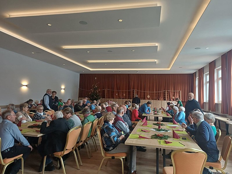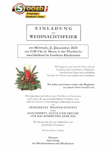 Unsere Weihnachtsfeier begann am 17. Dezember mit einem Gottesdienst für alle lebenden und verstorbenen Mitglieder. Beim anschließenden Mittagessen im Gh. Kirchenwirt konnte OB Alois Gangl 75 Mitglieder begrüßen. Als Ehrengäste waren Pfarrer Kret und Vizebgm. Josef Gattermann anwesend. Der Schülerchor unter der Leitung von Silvia Niedermaier und vorgetragene Gedichte von Christine Penzinger u. Josef Fasching sorgten für eine weihnachtliche Stimmung. Bei Kaffee und Kuchen - gespendet von Mitgliedern - fand die Feier einen gemütlichen Ausklang.